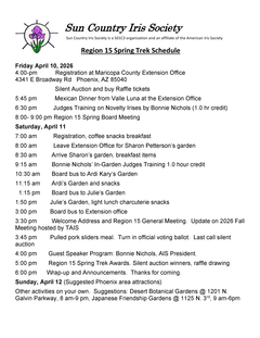 Includes Friday evening Mexican fare dinner, Saturday afternoon Pulled Pork BBQ, 3 garden tours (Gilbert, Sun City and Phoenix) by bus, and Judges Training led by AIS President Bonnie Nichols.